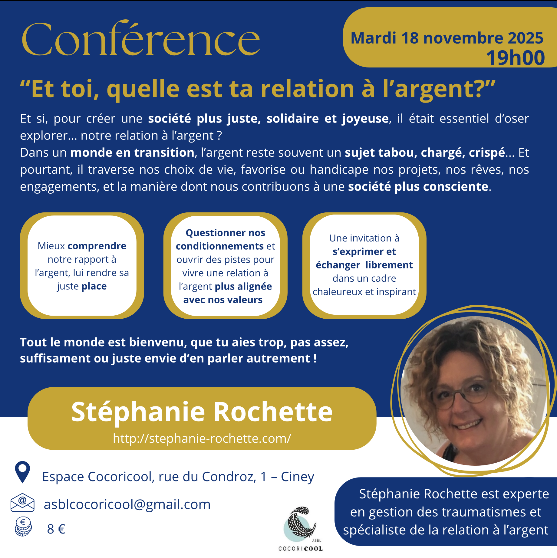 Nous vous proposons une conférence en compagnie de Stéphanie Rochette pour mieux comprendre notre rapport à l’argent et lui rendre sa juste place, tout en restant en accord avec nos valeurs.